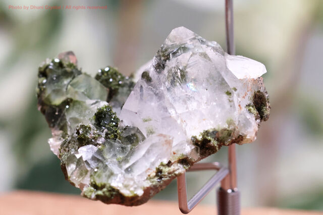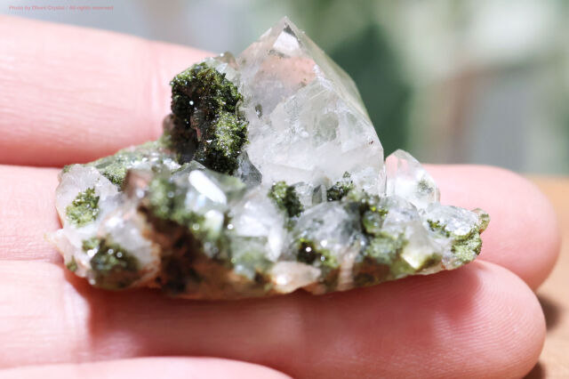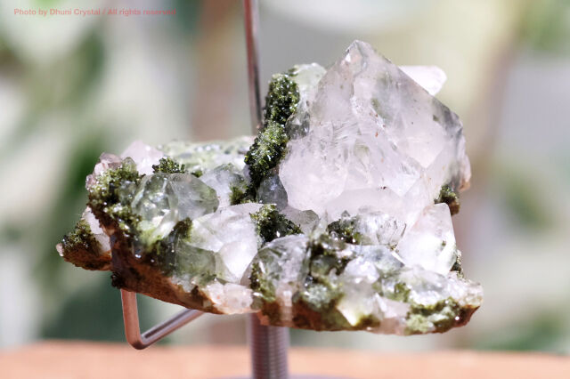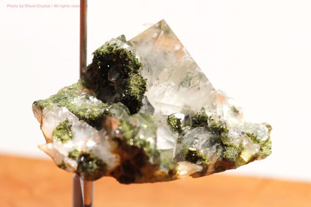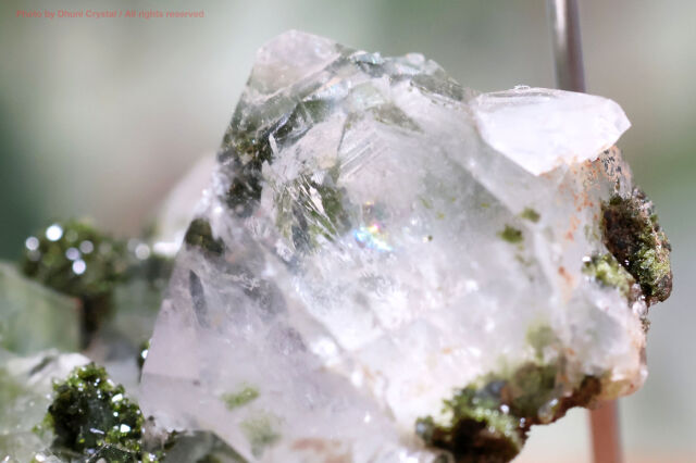 こちらは、透明感のある美しい水晶と、鮮やかなグリーンのエピドートが、キラキラと共生している神秘的な結晶です。