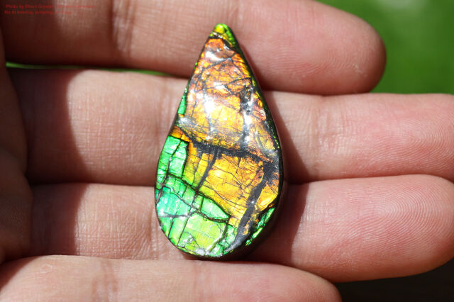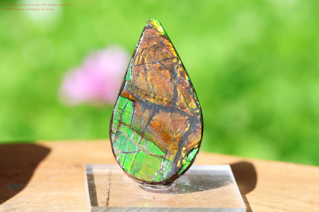 また、アンモ"ラ"イトはモース硬度が約3.5~8と比較的低く、乾燥や衝撃に弱いため、樹脂コーティングやダブレット加工などが施されます。こちらも樹脂コーティング済みとなります。
