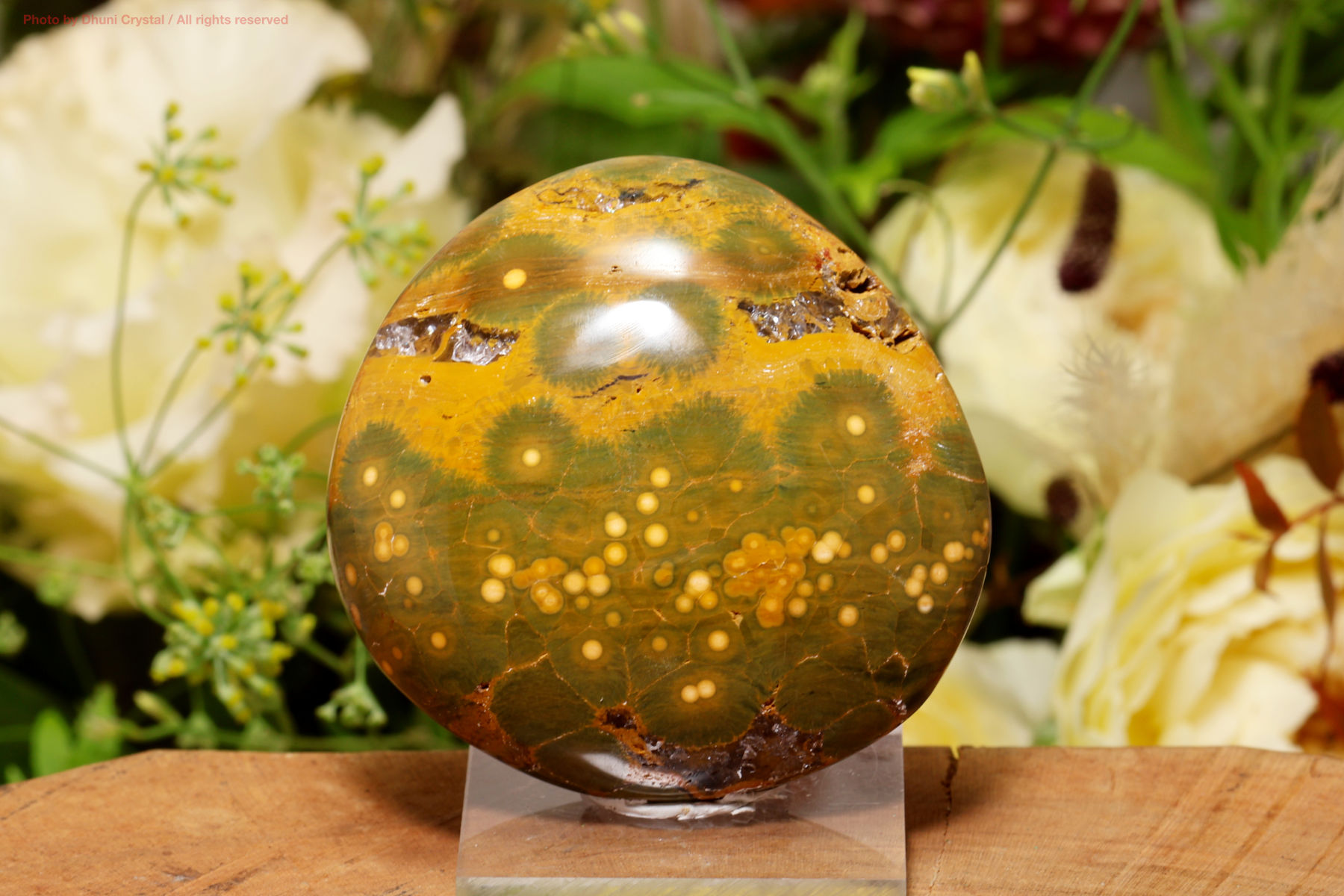 球状の模様(オービキュラー構造)が現れることからオービキュラー・カルセドニーとも呼ばれます。